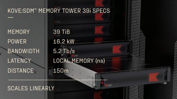 Founded in 2003, American firm Kove has quietly been supplying remote memory solutions to customers who found their workloads constrained not by compute, but by memory capacity. Kove's memory tower system presents as a rack of DRAM enclosures containing some management compute and high-performance NICs, and their software stack manages the remote memory and transfers to expose a memory pool that can be defined (configured or managed) entirely by software. With a maximum capacity of up to 256TiB (tebibyte, or 2^40 as opposed to 10^12 bytes) across several memory towers available as one unified address space with the local memory, bandwidth-intensive workloads can be accelerated without needing the compute to be throttled.