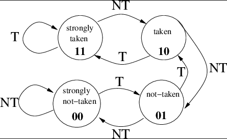 Structures such as 2-bit saturating counters as shown in the diagram are among the simplest of these predictors, where they flip between predicting that a branch should be taken or not taken depending on the counters state which changes based on how many times they have correctly or wrongly predicted the outcome. Moden CPUs use multiple and more complex predictors to make more informed decisions, with structures such as TAGE or neural predictors that consider the history of the instruction stream, its origin, and more to make informed predictions.