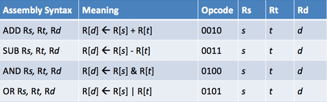 The instruction set architecture (ISA) is a description of how to make use of a piece of complicated hardware like a CPU, at a very simple and straightforward level. In the diagram, 4 such instructions that almost all CPUs would understand are shown. These instructions describe what to do to data that is kept in certain parts of memory, R (registers), and where to put the result. For the ADD example, it's clear that the instruction states that the hardware should collect the numbers in R[s] and R[t], add them together, and put them in R[d].
