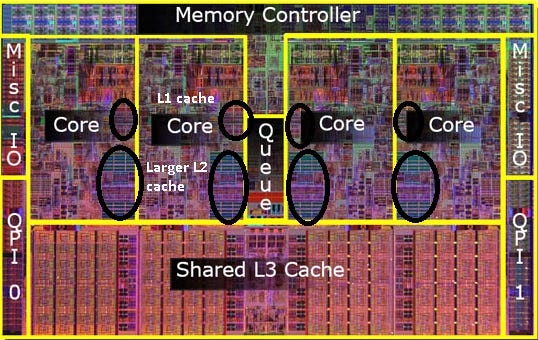 Compute components like CPUs and GPUs contain relatively small amounts of very well managed memory on device, known generally as caches. Since data used to compute is often re-used repeatedly, keeping recently used data close to compute (in caches) can reduce workload runtimes by many orders of magnitude. Caches are organised into levels, as shown in the diagrams, ranging from L1 (closest to the actual compute logic) to L3/4/5 (furthest from the compute, closer to RAM/Storage), and each level gets larger but also gets slower, as its physically further from where the data stored is actually used. Despite their small size and relative obscurity, the design, sizing, and management of these caches can have a significant impact on the performance of the device.