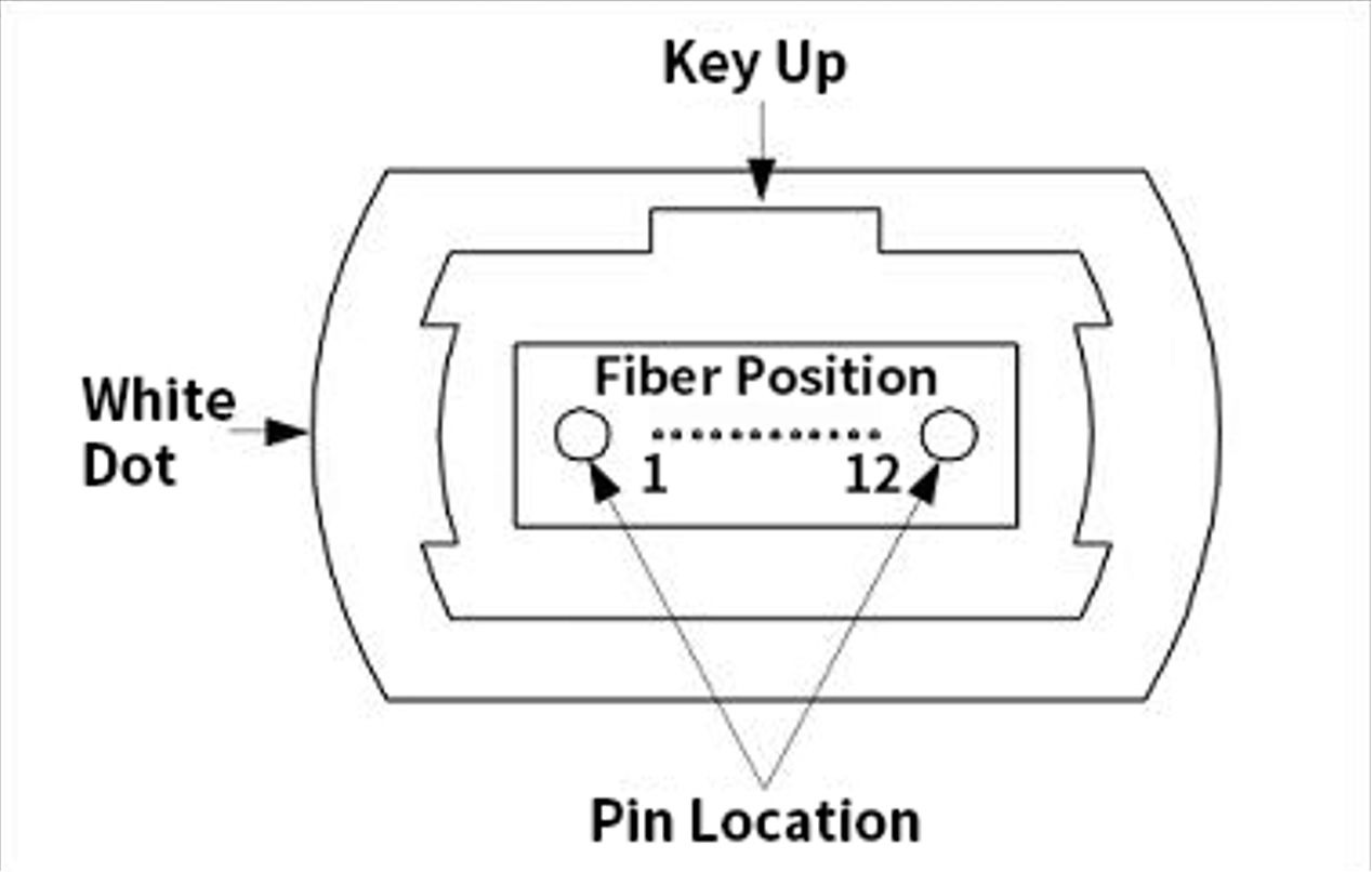 In MPO-12 cables, there are 12 fibres in a single row. The plastic connector housing has an alignment “key” centred on the top (see images below). On an MPO-16 cable, to prevent you from plugging this into a 12-fibre port (or vice-versa), the alignment key is offset to one side.