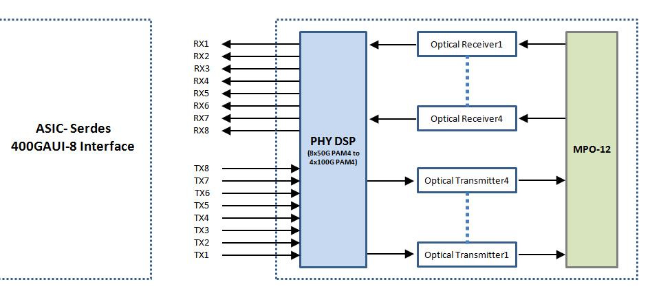 “...the step that takes 8 × 50 Gb/s electrical lanes (400 GAUI-8) and outputs 4 × 100 Gb/s optical lanes inside a 400 GbE pluggable is the lane aggregation in the module’s DSP/gearbox.